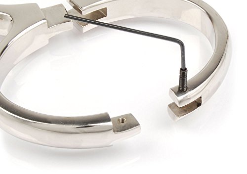 Die Kubind Handfessel ist ein klappbares Modell, das als starre Handschelle ausgelegt und mit einem Inbus Schlüssel zu bedienen ist. Durch die massive Fertigung aus vernickeltem Messing ist die Handschelle schwer und stabil, trotz der filigranen Form. Dadurch ist sie insbesondere für Sammler des Ungewöhnlichen von Interesse. Das Kubind Modell kann jedoch auch durch die verlässliche Funktion überzeugen. Ausgefallenes Sammlerstück mit Funktion Die Kubind Handschelle kann vollständig aufgeklappt werden, so dass beide Bügel zugleich offen oder geschlossen sind. Fixiert wird die Schließfunktion durch einen Inbus Schlüssel, der lediglich an einer Stelle zum Einsatz kommen muss. Passend zur zierlichen Form der massiven Handfessel ist auch der Schlüssel filigran gehalten. Die Optik ist dadurch insgesamt fein, nahezu nahtlos und durchgehend – wodurch die klappbare Handfessel mit Schraubschloss ein besonderes Schmuckstück in der Sammlung sein kann. Mit einem Gewicht von 300 Gramm liegt das Modell überraschend schwer in der Hand und lädt zum Testen der Schließfunktion ein. Durch die starke Bewegungseinschränkung der starren Handfessel sind selbstständige Manipulationsversuche nur äußerst schwierig durchzuführen. Ein versehentliches Schließen ist durch den Schraubverschluss allerdings ebenfalls unmöglich. Durch den Aufbau kann der Innendurchmesser der Handschelle nicht angepasst werden. Mit einem Umfang von etwa 19 Zentimetern reicht dieser für durchschnittliche und stärkere Handgelenke aus.Geliefert wird die starre, klappbare Handfessel von Kubind mit zwei Inbus Schlüsseln. Material: Messing, vernickelt Innenumfang: ca. 19 cm Gewicht: ca. 300 g Kubind Art-Nr.: KB-118 Lieferung mit einer zweiten Schraube und zweitem Imbus Schlüssel.