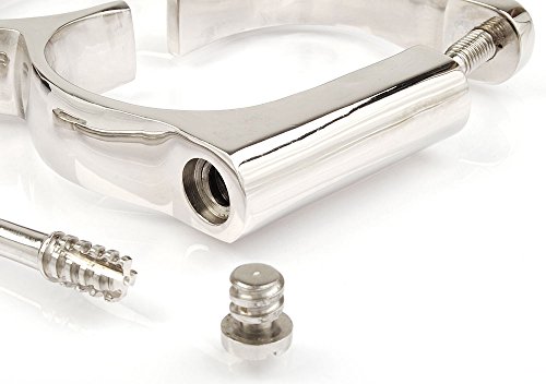 Wer in seiner Sammlung eine wahrhaft ungewöhnliche Handschelle präsentieren möchte, findet in der klappbaren Handfessel mit Schraubschlüssel aus dem Hause Kubind das passende Exemplar. Bereits das ausgefallene Schließsystem und der Schlüssel ziehen Blicke auf sich. Das glänzende Material und die detailgetreue Fertigung machen die hochwertige Ausführung zum Highlight. Dekoration mit Funktion – Das besondere Sammlerstück Gefertigt wurde die Handschelle von Kubind aus massivem Messing, das für die anziehend glänzende und silberfarbene Oberfläche vernickelt wurde. Die stabile Fertigung äußert sich bereits in dem vergleichsweise hohen Gewicht von 460 Gramm. Die Breite und Stärke lassen sie auch optisch erahnen. Wird das Modell angelegt, muss es vollständig aufgeklappt werden. Zum Anlegen und anschließenden Fixieren wird zunächst die Schraube hereingeschraubt. Zum zusätzlichen Erschweren von Manipulationsversuchen wird das Ende des Schlüssels als Schraubendreher verwendet und mit dessen Hilfe eine Abdeckung angebracht. Zum Öffnen der Handschelle wird umgekehrt vorgegangen. Es gilt also, zunächst die Abdeckung aufzuschrauben und im Anschluss die Schraube zu entfernen. Benötigt wird hierfür nur ein einziger Schlüssel, der im Lieferumfang enthalten ist. Aufgrund der Form und Beschaffenheit der Kubind Handfessel ist eine Anpassung nicht möglich. Der Innendurchmesser von circa 19,4 Zentimetern kann also nicht verändert werden. Dennoch können sich Sammler über zahlreiche Möglichkeiten der Präsentation freuen. Material: Messing, vernickelt Innenumfang: ca. 19,4 cm Gewicht: ca. 460 g ohne Schlüssel Kubind Art-Nr.: KB-115 Lieferung mit einem Schlüssel.