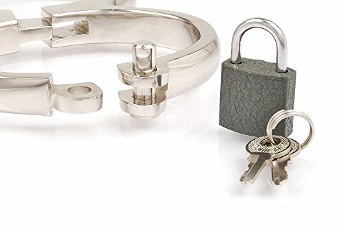 Die klappbare Handschelle mit Zapfen und Schloss aus dem Hause Kubind ist ein optisch interessantes Sammlerstück, das dennoch voll funktional ist. Durch den Aufbau werden beide Bügel zugleich geöffnet und geschlossen, das Arretieren ist daher verlässlich, verläuft schnell und einfach. Fixiert wird das Schloss mithilfe des Zapfens und eines Vorhängeschlosses. Die Präsentation in der Sammlung kann jedoch auch ohne Schloss, mit einer kleinen Kette oder einer anderen Schlossausführung erfolgen. Ausgefallene Handschelle für Sammler Das klappbare Modell Handfessel Modell mit Zapfen und grauem Schloss besteht aus Messing und wurde vernickelt, wodurch es eine anziehend glänzende und silberfarben Oberfläche aufweist. Die massive Fertigung lässt sich bereits durch das vergleichsweise hohe Gewicht erahnen. Trotz vergleichsweise filigraner Form wiegt die Handschelle etwa 320 Gramm. Der einzusetzende Zapfen und das Vorhängeschloss sind hierin bereits enthalten. Da die Handfessel aus dem Hause Kubind voll funktionstüchtig ist, erfolgt die Lieferung mit passendem Schloss und zwei Schlüsseln. Für die Präsentation in der Sammlung aber auch zum Ausprobieren ist die metallene Fessel also ideal. Die Form und Funktion erlauben jedoch keine Anpassung des Innenumfangs der beiden Bügel, der bei circa 18,5 Zentimetern liegt. Passend ist das Modell also für durchschnittliche und stärkere Handgelenke. Material: Messing, vernickelt Innenumfang: ca. 18,5 cm Gewicht: ca. 320 g incl. Zapfen und Vorhängeschloss Kubind Art-Nr.: KB-117 Lieferung mit zwei Schlüsseln.